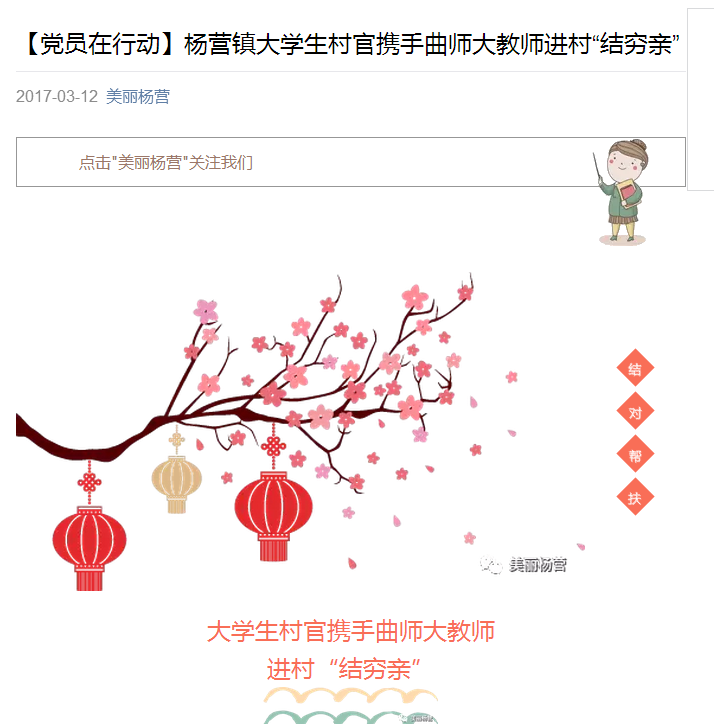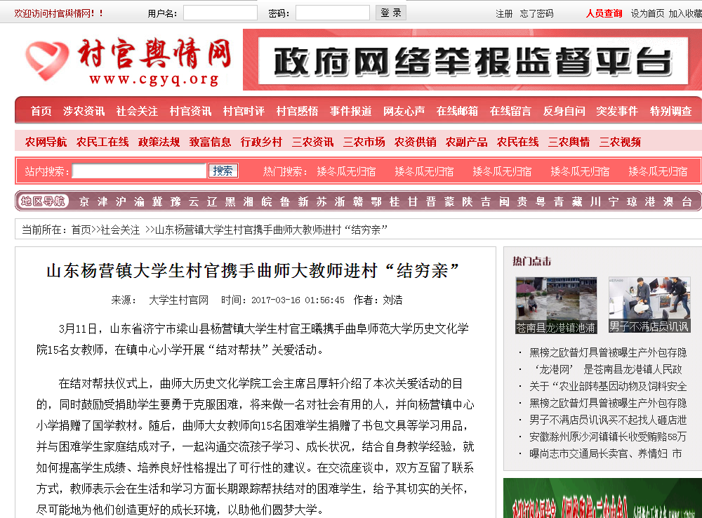 为庆祝“三八丽人节”,历史文化学院工会在院党委的领导支持下,组织全院女教工到济宁市梁山县杨营镇,给机关干部宣讲廉政文化,和杨营镇中心小学贫困家庭儿童结对爱心帮扶,度过了一个不同寻常的节日。该活动被多家媒体宣传报道,以下为部分媒体报道统计: