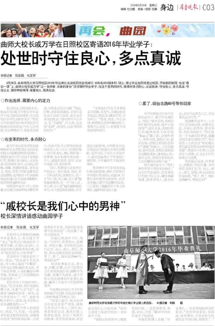 齐鲁晚报:曲师大校长戚万学寄语毕业学子:处世时守住良心 多点真诚