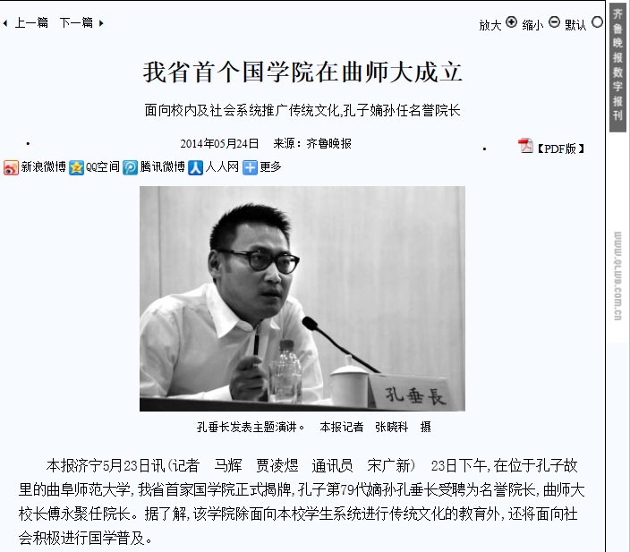 齐鲁晚报:我省首个国学院在曲师大成立
