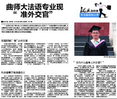 6月5日,《济宁晚报》刊发通讯《曲师大法语专业现准“外交官”》,报道了我校外国语学院应届毕业生朱海波,以优异成绩考取外交部公务员的消息。 报道挖掘总结了朱海波四年的大学生活,通过一个典型事例反映出我校优良的校风学风,广大青年学生积极进取、敢于追梦的群体形象。