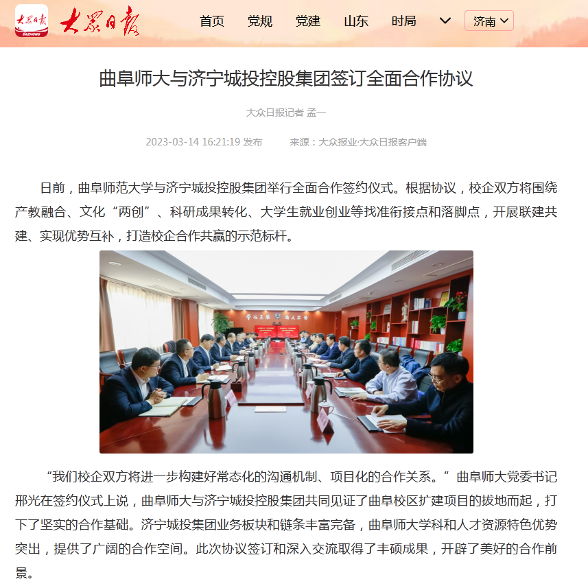 【大众日报】曲阜师大与济宁城投控股集团签订全面合作协议
