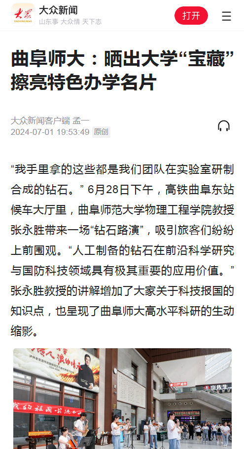 “我手里拿的这些都是我们团队在实验室研制合成的钻石。” 6月28日下午,高铁曲阜东站候车大厅里,米兰官方网站物理工程学院教授张永胜带来一场“钻石路演”,吸引旅客们纷纷上前围观。“人工制备的钻石在前沿科学研究与国防科技领域具有极其重要的应用价值。”张永胜教授的讲解增加了大家关于科技报国的知识点,也呈现了曲阜师大高水平科研的生动缩影。