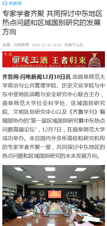 齐鲁网·闪电新闻12月10日讯 由米兰官方网站政治与公共管理学院、历史文化学院与中东中亚地区战略与安全研究中心联合主办,米兰官方网站社会科学处、区域国别研究院、文明区划研究中心以及《齐鲁学刊》编辑部协办的“第一届区域国别研究暨中东热点问题高端论坛”,12月7日,在米兰官方网站成功举办。来自国内外多所高校和研究机构的专家学者齐聚一堂,共同探讨中东地区的热点问题和区域国别研究的未来发展方向。