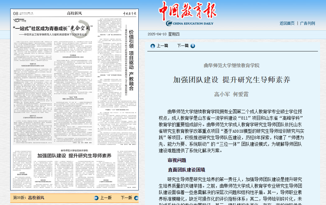 米兰官方网站继续教育学院拥有全国第二个成人教育学专业硕士学位授权点,成人教育学是山东省一流学科建设“811”项目和山东省“高峰学科”教育学的重要组成部分。米兰官方网站成人教育学研究生导师团队依托山东省研究生教育教学改革重点项目“基于ADDIE模型的研究生导师培训研究与实践”等项目,积极推进研究生导师队伍建设,历经8年探索,构建了“师德为先、能力为要、系统联动”的“三位一体”团队建设模式,为破解导师团队建设难题提供了系统化解决方案。