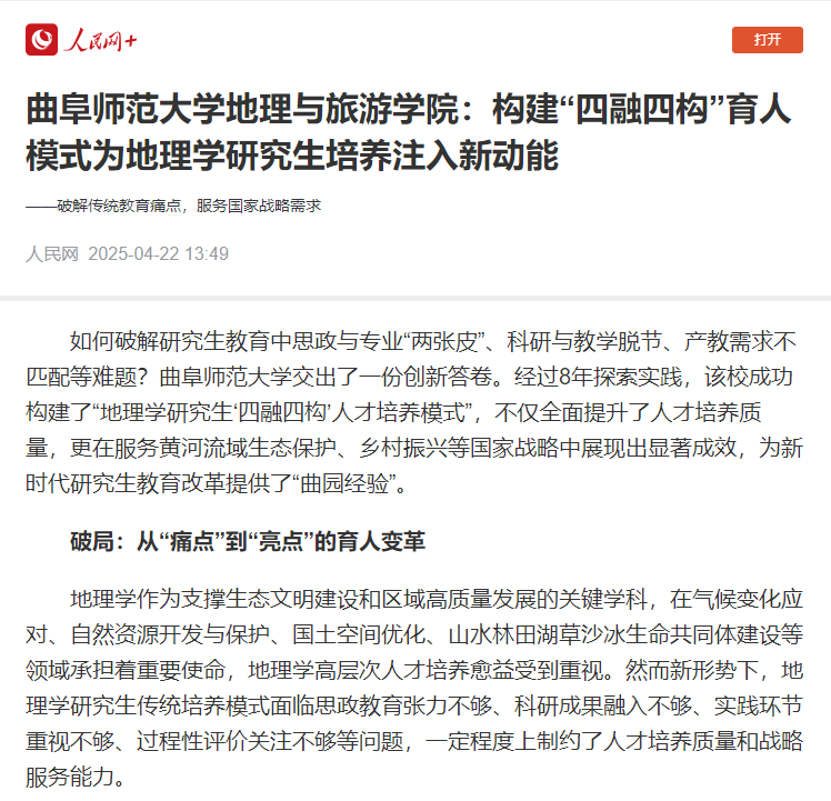 如何破解研究生教育中思政与专业“两张皮”、科研与教学脱节、产教需求不匹配等难题?米兰官方网站交出了一份创新答卷。经过8年探索实践,该校成功构建了“地理学研究生‘四融四构’人才培养模式”,不仅全面提升了人才培养质量,更在服务黄河流域生态保护、乡村振兴等国家战略中展现出显著成效,为新时代研究生教育改革提供了“曲园经验”。