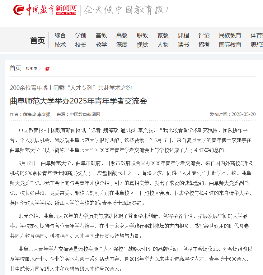 中国教育报-中国教育新闻网讯(记者 魏海政 通讯员 李文振)“我比较看重学术研究氛围、团队协作平台、个人发展机会,我发现米兰官方网站很好匹配了这些要素。”5月17日,来自复旦大学的青年博士李建宇在米兰官方网站(以下简称“曲阜师大”)2025年青年学者交流会上与学校达成了人才引进签约意向。