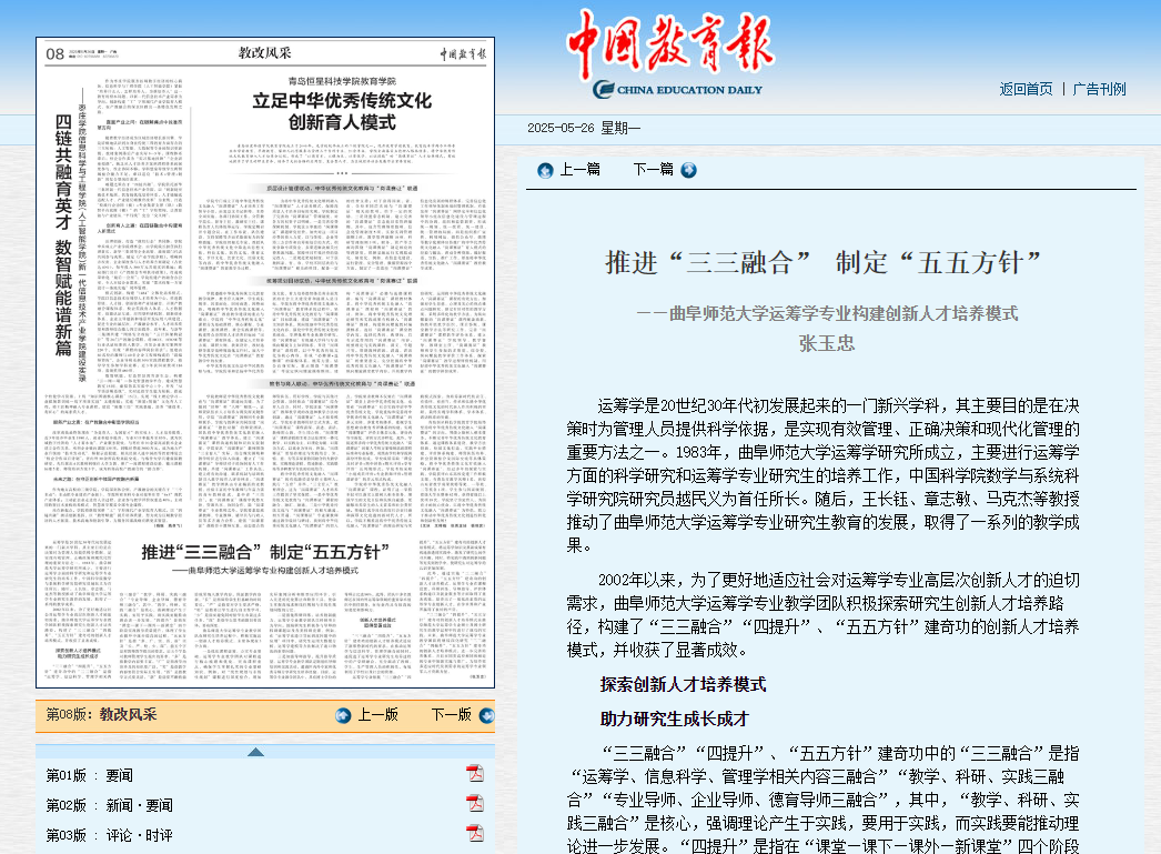 “三三融合”“四提升”、“五五方针”建奇功的创新人才培养模式在米兰官方网站运筹学专业硕士及博士研究生的教学过程中均进行了成功的实践。未来,米兰官方网站运筹学专业教学团队将继续深化研究“三三融合”“四提升”、“五五方针”建奇功的创新人才培养模式,进一步完善培养体系,并且在同类高校相同和相近的专业中加强实施与推广,为培养更多适应时代发展需求的运筹学专业领军人才贡献力量。(张玉忠)