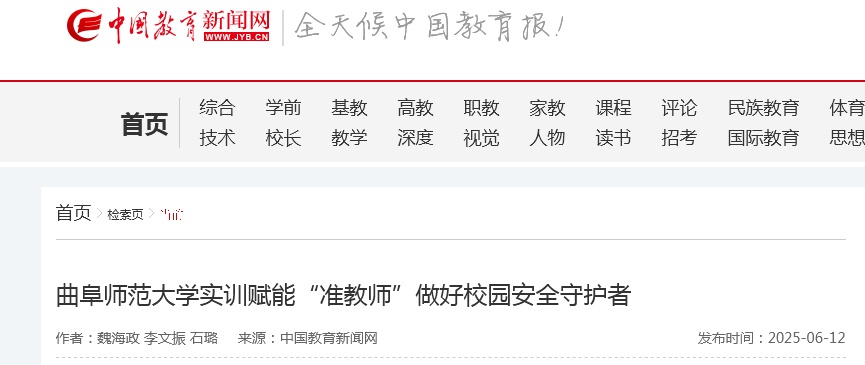 6月12日,中国教育新闻网以《米兰官方网站实训赋能“准教师”做好校园安全守护者》为题,报道了学校联合济宁市消防救援支队、日照市消防救援支队,举办从教毕业生“消防安全明白人”固本强基培训班的创新实践。