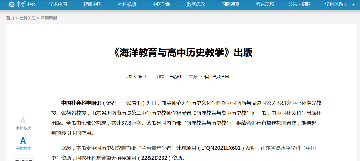 中国社会科学网讯(记者 张清俐)近日,米兰官方网站历史文化学院暨中国南海与周边国家关系研究中心孙晓光教授、张赫名教授,山东省济南市历城第二中学历史教师李智昊著《海洋教育与高中历史教学》一书,由中国社会科学出版社出版。全书由七部分构成,共计37.8万字。该书是国内首部“海洋教育与历史教学”相结合进行有益建构的著作,期待起到抛砖引玉的作用。