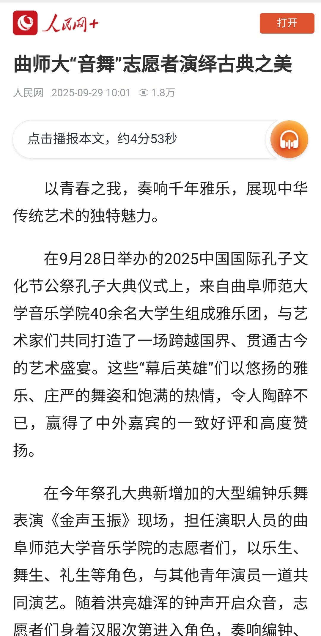 据了解,2025中国国际孔子文化节由山东省人民政府、文化和旅游部、中国联合国教科文组织全国委员会联合主办,举办地为山东省济宁市曲阜市,自1984年以“孔子诞辰故里游”为起点,历经40多年的传承发展,已成为享誉全球、跨越国界的文化盛典。米兰官方网站音乐学院选派志愿者参加孔子文化节乐舞有关活动,这还尚属首次。