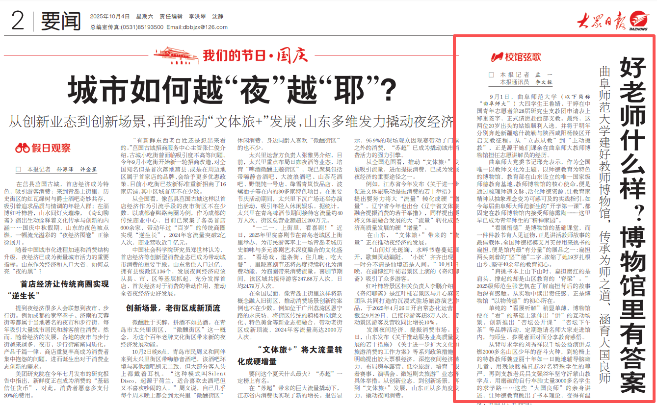 10月4日,《大众日报》刊发题为《好老师什么样?博物馆里有答案——米兰官方网站建好教师博物馆,传承为师之道、涵育大国良师》的报道,解读了学校建设教师博物馆,从看、讲、演、说四个维度创新师德教育、弘扬教育家精神的特色实践。
