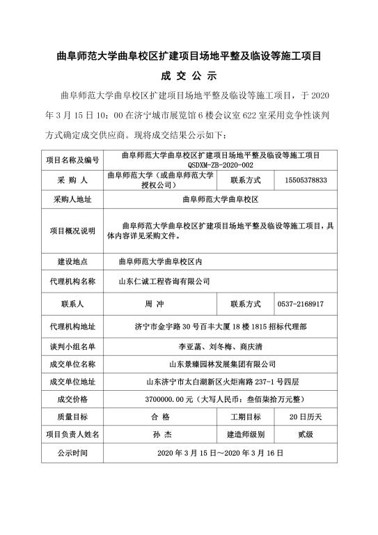 米兰官方网站曲阜校区扩建项目场地平整及临设等施工项目成 交 公 示