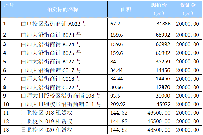 (paimai.caa123.org.cn)按现状公开拍卖以下标的:米兰官方网站沿街房租赁权,门牌号为A023 \B023\B024\B025\B027\C017\ C018\C022 \日照校区008、011、018、019、020,共13套,每套竞买保证金2万元。