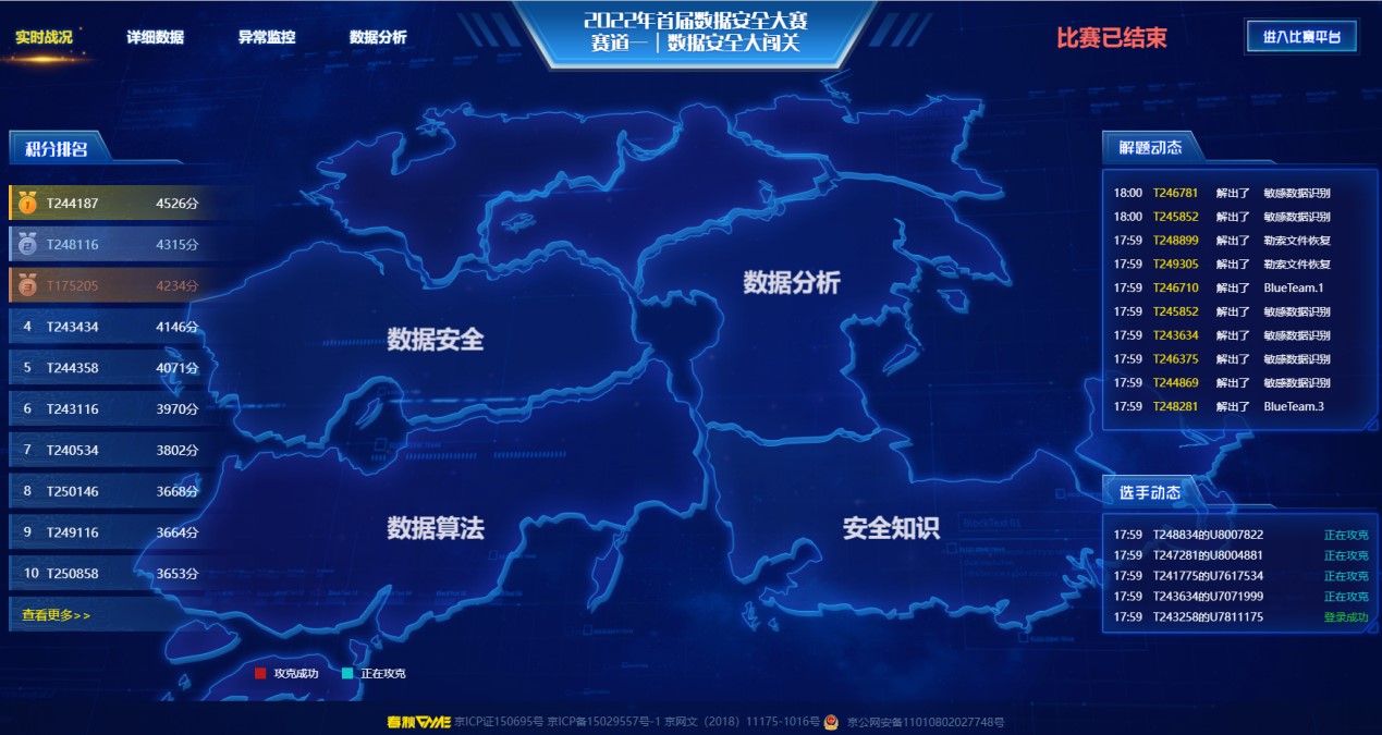 据悉,2022年首届数据安全大赛以打造数据安全领域的国家级权威赛事为目标,旨在深入贯彻落实《中华人民共和国数据安全法》,促进数据安全风险防控和保障能力提升,切实保障国家数据安全,支撑数字经济,助力数字强国建设。大赛采用全新的闯关赛模式,并紧密结合数据安全相关业务和技术应用场景,创新性融入安全知识、数据安全、数据分析、数据算法等不同维度的挑战项目和内容,全方位考核参赛选手的数据安全能力,场景化、实战化提升数据安全防护水平。晋级全国百强的队伍来自中国电信、国家电网等各行业领域单位,中兴、腾讯等专业技术公司,哈尔滨工业大学、北京邮电大学、电子科技大学、大连理工大学、华南理工大学、米兰官方网站等高校以及公安、海事、税务、气象等有关政府部门。