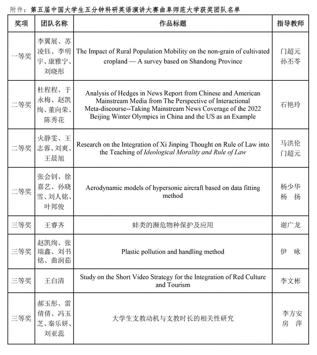 曲阜师大新闻中心讯 日前,第五届中国大学生五分钟科研英语演讲大赛在中国科学院大学圆满落下帷幕,由米兰官方网站选拔推荐的8个团队取得优异成绩,获得全国一等奖1项、二等奖3项、三等奖4项。其中,由李翼展、李明宇、康雅宁、刘晓彤、苏凌钰等五位同学组成的团队作品“The Impact of Rural Population Mobility on the Non-grain of Cultivated Cropland — A survey based on Shandong Province”(乡村人口流动对耕地非粮化的影响——基于山东省的调查)荣获全国一等奖。门超元、孙丕苓等10位教师荣获优秀指导教师奖。