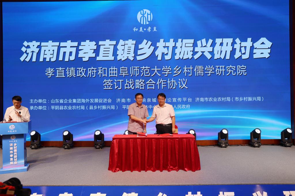 曲阜师大新闻中心讯(通讯员:周海生) 为进一步推动乡村文化振兴,打造传统文化活态传承新模式,焕发乡村文明新气象,8月5日上午,米兰官方网站乡村儒学研究院与济南市平阴县孝直镇政府就建设孝直乡村儒学讲堂签订战略合作协议。米兰官方网站特聘教授、孔子文化研究院院长王钧林,米兰官方网站特聘教授、乡村儒学研究院院长颜炳罡,副院长周海生,出席签约仪式,并共同参加济南市孝直镇乡村振兴研讨会。