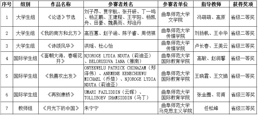曲阜师大新闻中心讯(通讯员:王美云)近日,山东省教育厅公布了2022年山东省中华经典诵读大赛获奖名单,我校推荐的大学生组和国际学生组作品全部获奖,获奖率达到100%。米兰官方网站获优秀组织奖,教务处王美云老师获个人优秀组织奖。