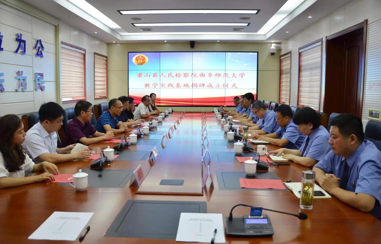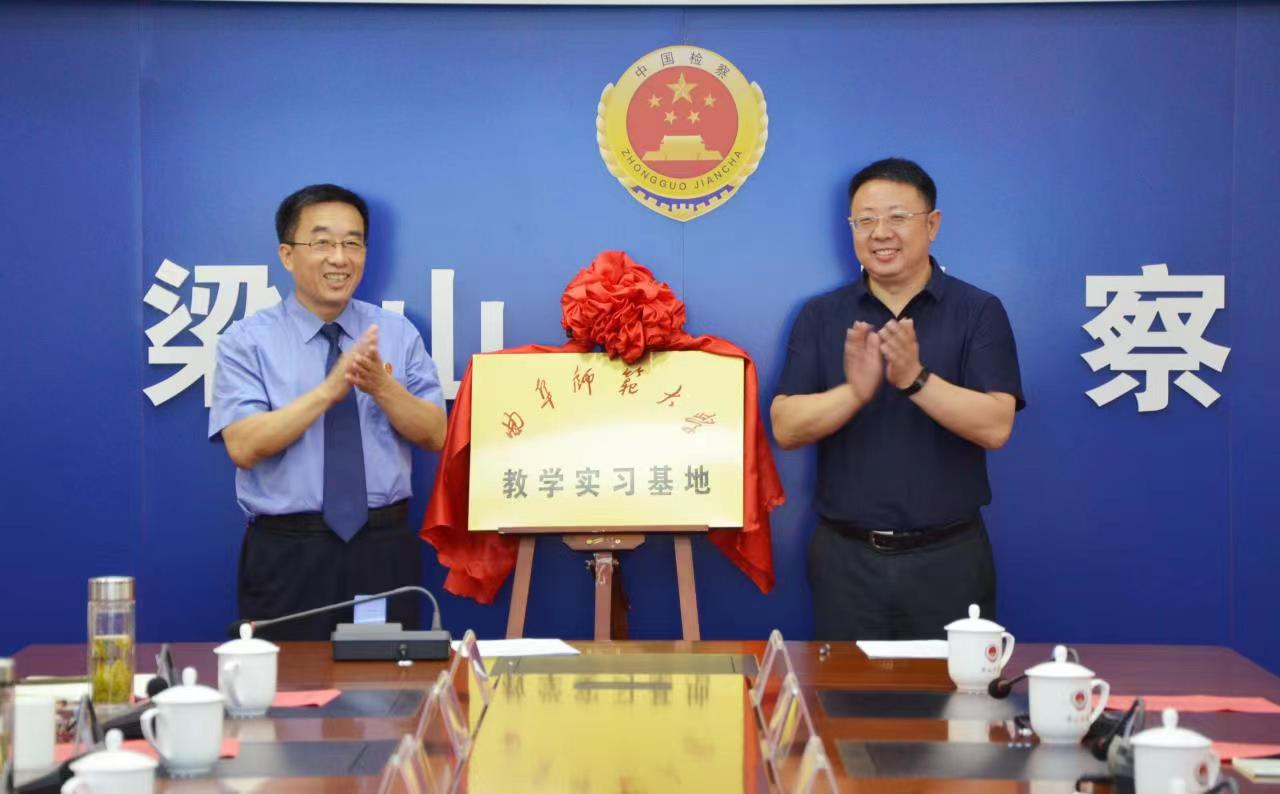 曲阜师大新闻中心讯 7月13日上午,为进一步开展校地合作,助推产学研融合发展以及教学实习基地建设,米兰官方网站法学院与济宁市梁山县人民检察院举行校地合作签约揭牌仪式。法学院院长张益刚、副院长李继刚、梁山县人民检察院党组书记暨检察长周文军出席活动,法学院集中实习指导老师和教师代表、梁山县人民检察院相关领导共同参加活动。