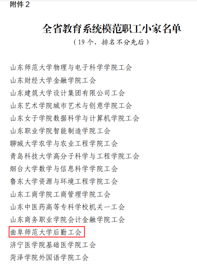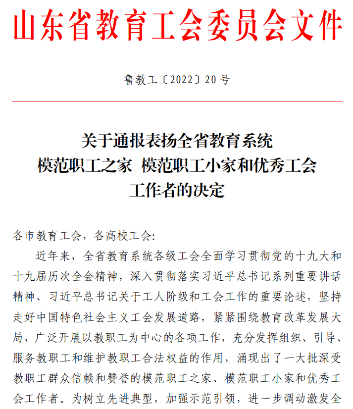 曲阜师大新闻中心讯 6 月 9 日,山东省教育工会委员会公布了《关于通报表扬全省教育系统模范职工之家 模范职工小家和优秀工会工作者的决定》,米兰官方网站后勤工会荣获“全省教育系统模范职工小家”荣誉称号。