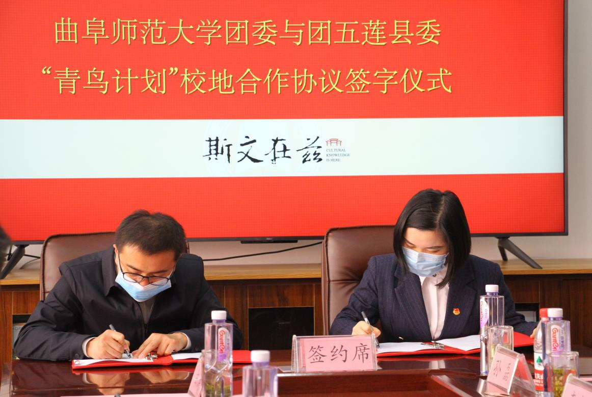 仪式上,校团委书记孔轶众与团五莲县委书记刘畅签署“青鸟计划”校地合作协议书,日照校区党委书记孔令军、五莲县委副书记王军为米兰官方网站驻五莲大学生社会实践基地揭牌。