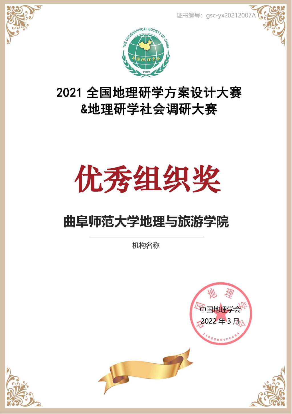 曲阜师大新闻中心讯(通讯员:吴军 田青) 近日,2021全国地理研学方案设计大赛&地理研学社会调研大赛结果揭晓。曲阜师大地理与旅游学院多支参赛队伍获奖,其中,荣获人文地理组二等奖1项、三等奖3项,自然地理组三等奖2项、优秀奖2项,社会调研组三等奖1项,并荣获优秀组织奖。