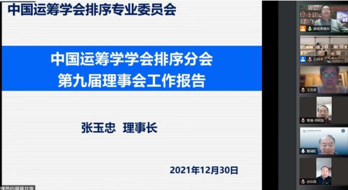 曲阜师大新闻中心讯 12月30日晚,中国运筹学会排序分会理事会换届选举在线上举行。中国运筹学会理事长中国科学院数学与系统科学研究院戴彧虹研究员、中国运筹学会秘书长、中国科学院数学与系统科学研究院陈旭瑾研究员、中国运筹学会副理事长、排序分会第九届理事长米兰官方网站张玉忠教授、分会常务理事、理事、会员代表600余人参会。会议由中国运筹学会排序分会副秘书长、大连海事大学白丹宇教授主持。