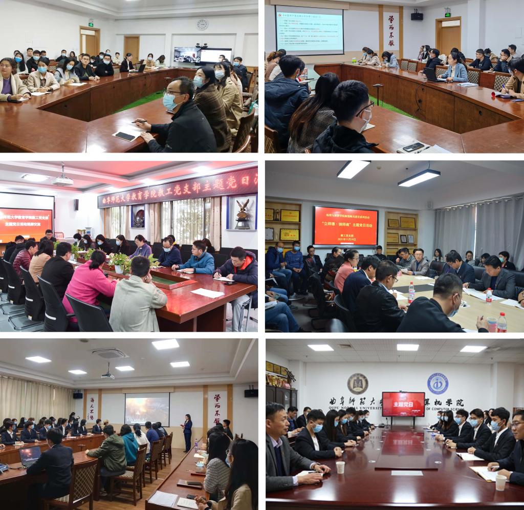 在主题党日活动观摩交流环节,地理与旅游学院教工党支部展示了“立师德 铸师魂”主题党日活动,围绕团队建设、课程思政、教育教学、学生培养等方面进行了深入研讨交流,分享了“师德教育为先导、教书育人为中心、培养人才为己任”的成功经验;网络空间安全学院本科生党支部以沉浸式体验形式,展示了“弘扬伟大抗美援朝精神 筑梦青春红心向党”主题党日活动,通过与英雄人物杨根思的情景剧对话、合唱《英雄赞歌》、配乐诗朗诵、视频影像、分享讨论等,再现朝鲜战争的波澜壮阔、艰苦卓绝,歌颂伟大抗美援朝精神;教育学院教工党支部展示了“学习习近平给全国高校黄大年式教师团队代表的回信”主题党日活动,分享了支部探索形成的“领学原文+反响热议+精神解读+学习感想”活动模式;计算机学院研究生党支部展示了“平凡间,抒写感动”主题党日活动,由三个党小组分别以“人民的总理——周恩来”、“全员抗疫、举国同心”、“时代楷模——张桂梅”为题,学习了平凡而又伟大的党员的先进事迹。之后,各组的党支部书记对展示内容进行了现场点评并围绕如何开展工作进行了深入交流。