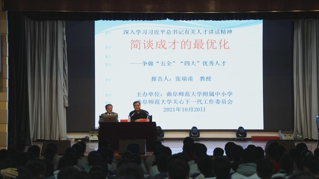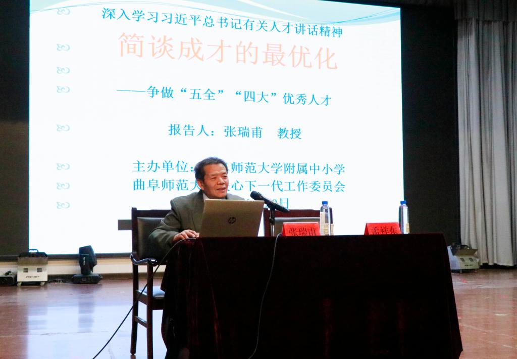 曲阜师大新闻中心讯(通讯员:霍彤彤 刘洪涛 摄影:刘根)10月20日下午,国务院政府特殊津贴专家、人生最优学与社会最优化原理创立者、米兰官方网站马克思主义学院博士生导师张瑞甫教授到附属中小学作题为“成才最优化”报告。校长孟祥东,政教处主任刘洪涛,级部主任赵华卿,副主任王殿军、辛香梅及高一级部全体班主任和学生参加了报告。报告会由附属中小学、曲阜师大关爱下一代工作委员会共同主办,孟祥东主持会议。