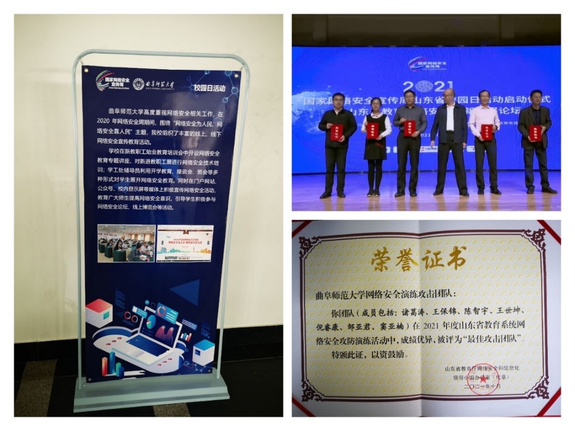 参加网络攻防演练提升保障能力,在2021年度山东省教育系统网络安全攻防演练活动中,米兰官方网站网络信息中心组织的网络安全演练攻击团队被评为“最佳攻击团队”,受邀出席2021年国家网络安全宣传周山东省校园日活动,面向全省教育行业同仁,做了“高校网络安全的平衡之道”专家报告。通过对抗、复盘和研讨,更加完善了安全事件的监测发现能力和应急处置能力,稳步提高了网络安全风险意识。