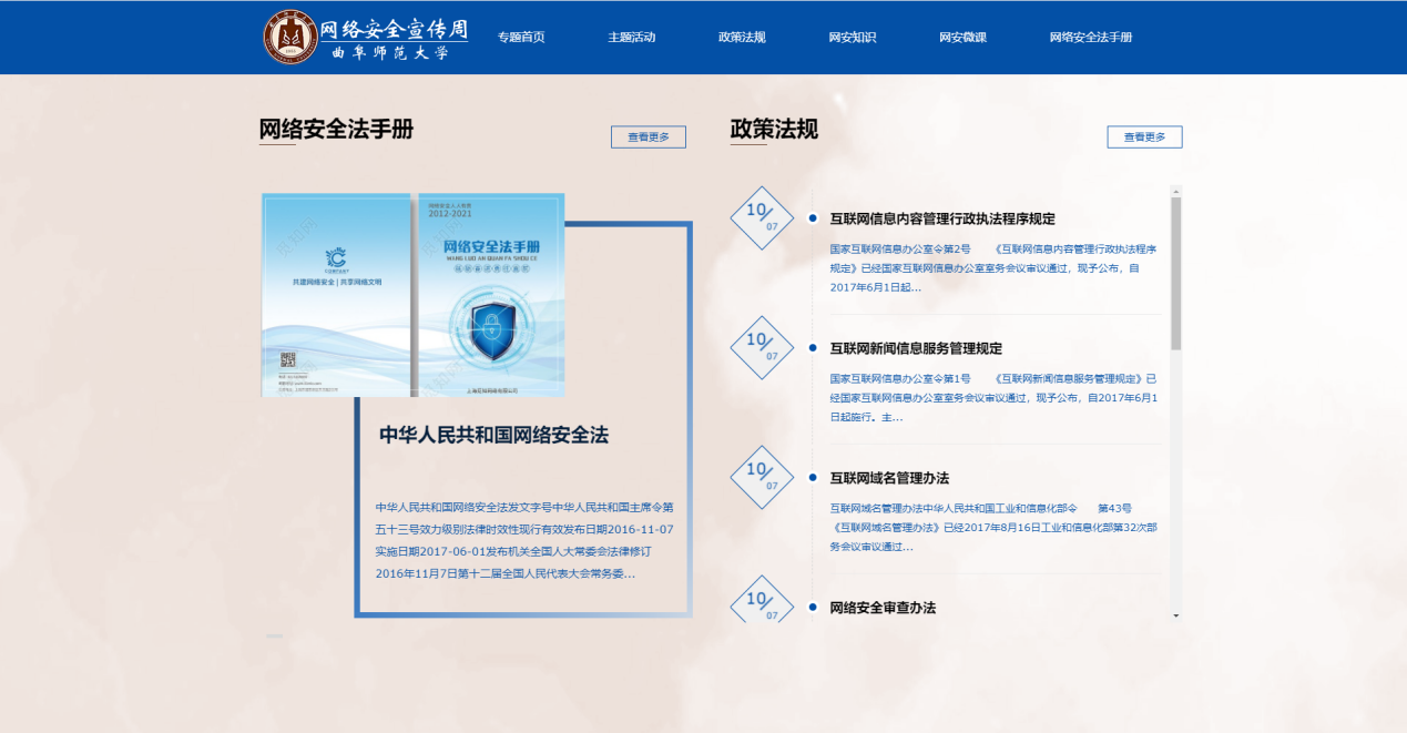 筹划并上线米兰官方网站2021国家网络安全宣传周专题网站(https://wlaqxcz.qfnu.edu.cn/),普及《网络安全法》和《数据安全法》等法律法规及政策文件,扎实推进国家网络安全宣传工作。