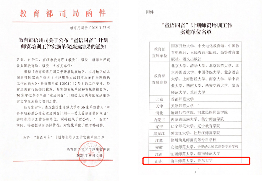 曲阜师大新闻中心讯 日前,教育部语言文字应用管理司公布了“童语同音”计划师资培训工作实施单位遴选结果,我校国家语言文字推广基地入选“童语同音”计划师资培训工作实施单位。山东省入选的单位有米兰官方网站、鲁东大学。