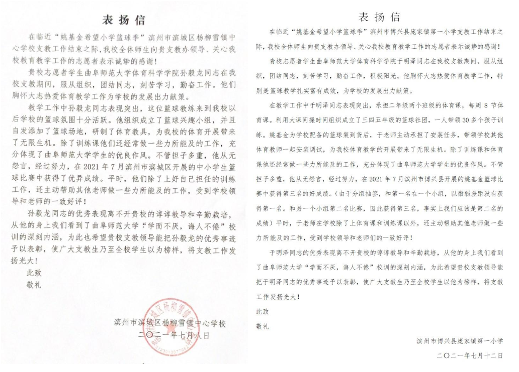 姚基金希望小学篮球季于2021年首次落地山东,作为姚基金项目升级后的首次活动,吸引了各级政府、社会组织、爱心企业和乡村小学广泛参与。我校作为该项目在山东省唯一的合作高校,承担着为大赛提供专业支教志愿者的重任,体育科学学院党委积极贯彻落实国家体教融合、体育强国战略重要思想,统筹调度,合理安排,通过志愿报名、专业培训、专项考核等环节,精心遴选出101名优秀篮球专业大学生,为全省11个项目县的101所乡村小学提供志愿支教活动。志愿服务期间,我校学子克服困难、勤奋工作,受到支教学校师生的一致好评,我校先后收到多所支教学校的表扬信函。