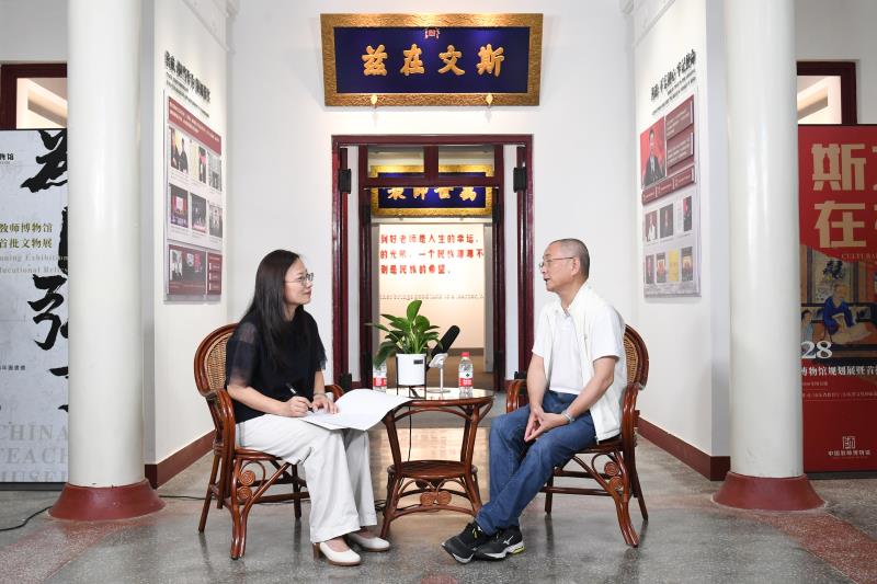 参观过程中,孙祥广谈到了教师博物馆与文学院拟共同开展教师影像研究的有关设想,刘醒龙表示教师影像蕴涵着重要的历史和教育价值,同样是宝贵的教育遗产,对此予以大力支持。他欣然接受了文学院刘聪教授的专访。关于两部知名教师题材作品《凤凰琴》《天行者》的创作初衷,刘醒龙说:“《凤凰琴》是我对生活的感动,《天行者》是我对历史的沉思。中国的改革开放之所以能够迅速发展,其中也包含着乡村教师为振兴乡村教育作出的重要贡献。现在世界有的国家变革如此艰难,因为社会普遍受教育程度偏低,这就阻碍了文明进程。而一段时期中,中国的乡村教师以他们最素朴的一种力量,形成了改变当时教育现状乃至影响社会进步的一种可能,所以我在长篇小说《天行者》的扉页上,写了一句话‘献给在二十世纪后半叶中国大地上默默苦行的民间英雄’ 。”