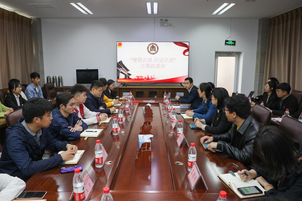 曲阜师大新闻中心讯 4月30日,由校团委主办,研究生团工委承办的“情暖曲园 共话未来”主题座谈会在日照校区举行。校团委副书记刘蓉,学生工作处副处长郑勇,中国青年报社运营中心项目主管刘亚廷,中国青年报社运营中心新闻事业部项目主管王彦舒,北京大学、清华大学、浙江大学等10所高校的硕博生和日照校区相关专业硕博生参加座谈。