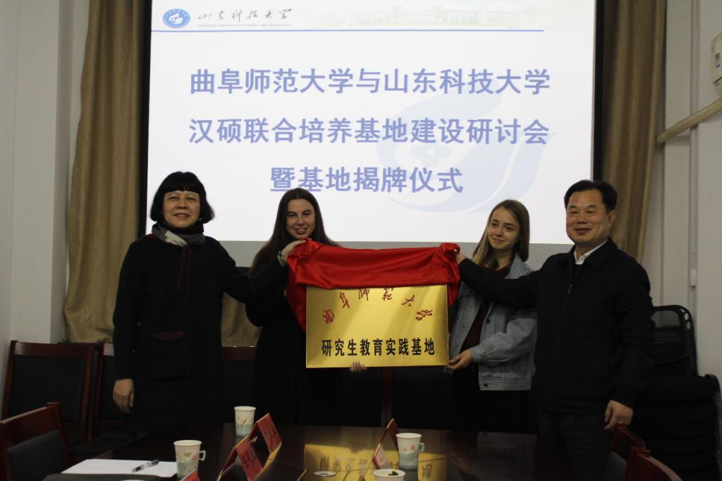 仪式上,夏静、曹茂永共同为我校汉硕联合培养基地揭牌。随后,我校老师看望了在山科大实习的部分学生。