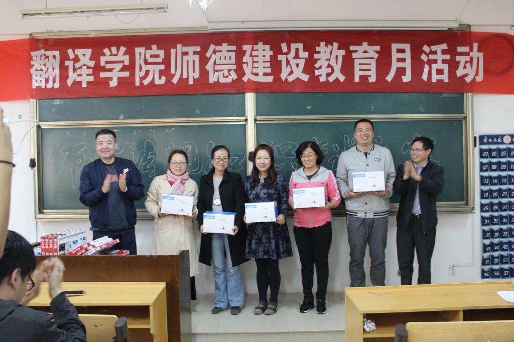 翻译学院本年度师德教育建设活动由走访慰问优秀荣休教师、全院师德法规知识考试竞赛、师德标兵和最美教工与全院教职工的师德经验交流会三部分组成。本次活动以“党”的十九大为指导,以做“四有好老师”为主题,以习近平《在北京大学师生座谈会上的讲话》、《教育法》、《高等教育法》、《教师法》、《高校教师职业道德规范》、《国家教育规划纲要》等法规文件中有关师德的要求为主要考试内容。