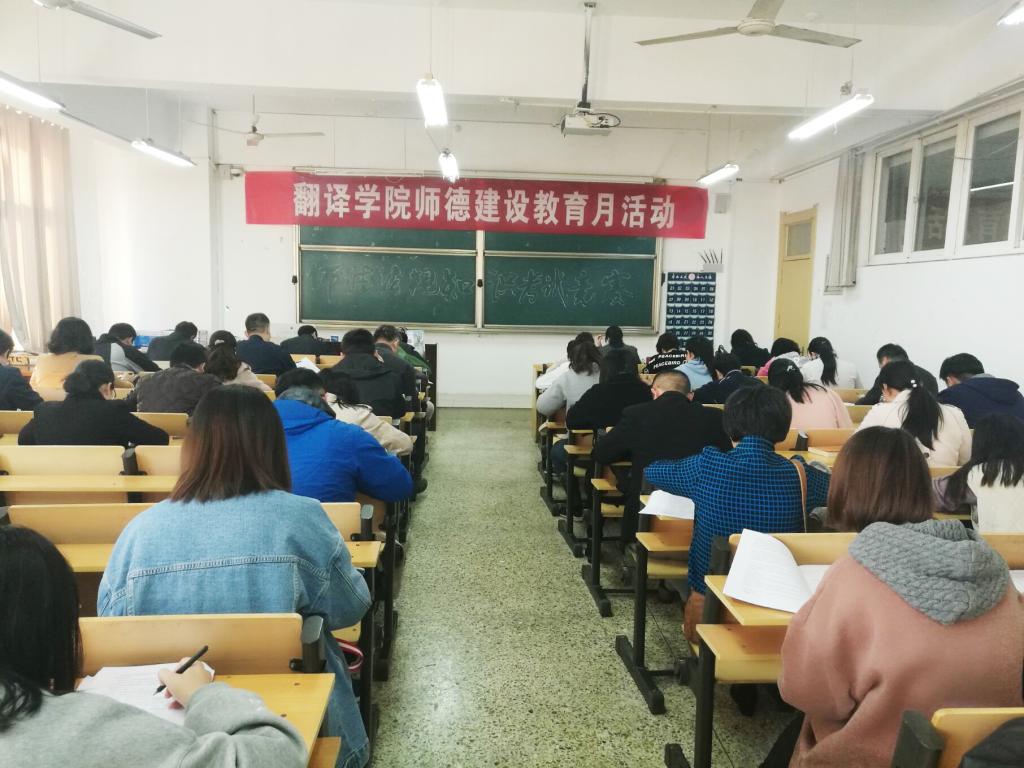 10月31日下午,翻译学院全体教职工参加了全院师德法规知识考试竞赛活动,本次活动是翻译学院根据山东省教育工会《关于在全省教职工中开展师德建设教育月活动的通知》和山东省教育厅《关于做好庆祝2018年教师节有关工作的通知》精神,以及学校工会《关于在全校教职工中开展师德建设教育月活动的通知》而进行的一场覆盖全院教职工的师德建设教育活动。