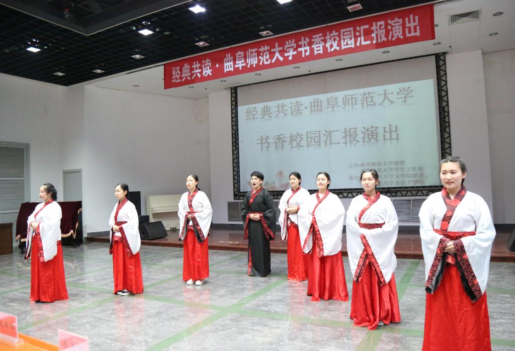 乘世界读书日之风,品经典传统之韵。为鼓励和引导青年大学生多读书、读好书,引导同学们体会阅读的乐趣,感受阅读的力量,在诵读经典中感受中华文化的源远流长,我校受邀参与由广西师大出版社发起的、与北京大学等65所全国高校携手举办“观文馆4.23经典共读”系列活动。4月23日晚,由校团委、校学生工作处等主办,文学院团委承办的“书香校园·文学院经典共读”汇报演出在大学生活动中心举行。图书馆、学生工作处、教务处、团委、文学院等单位负责人及等文学院师生代表参加了活动。