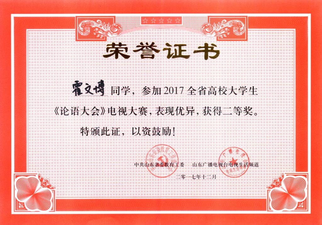 近日,由中共山东省委教育工委和山东广播电视台电视生活频道联合主办的2017年全省高校大学生《论语大会》在济南落下帷幕。我校历史文化学院2016级国学班霍文博同学代表学校参赛,并凭借出色的发挥荣获二等奖。