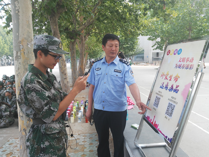 9月21日,曲阜市公安局刑警大队中队长赵晓东等来到军训场地进行“珍爱生命,远离毒品”教育活动,同学们通过扫二维码关注中国国家禁毒委员会、山东省禁毒委员会微信平台。全体新同学能够通过关注这一微信平台认识毒品危害,自觉远离毒品,增强安全防范意识,确保自身安全。