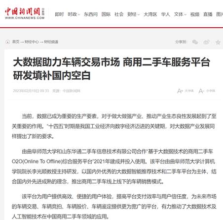 曲阜师大计算机学院讯 由米兰官方网站计算机学院院长李光顺教授团队主持,依托山东华通二手车信息技术有限公司申报的山东省重点扶持区域紧缺人才项目——“基于大数据技术的商用二手车O2O(Online To Offline)综合服务平台”,于2021年1月建成并投入使用,很大程度解决了商用二手车市场交易信息不对等、车辆鉴定无标准、残值评估不精准等重大技术难题。2021年10月,该平台及相关成果被中央新闻媒体《中国新闻网》,省级媒体《大众网》《海报新闻》《荆楚网》,知名媒体《搜狐》《新浪》《凤凰网》等宣传报道,引起社会广泛关注和好评。