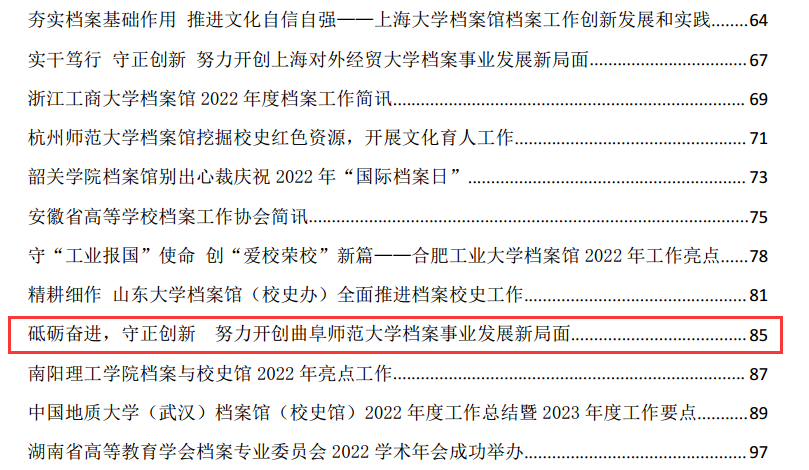 曲阜师大档案馆讯 日前,2022年度《中国高等学校档案工作简报》发布,曲阜师大典型工作案例《砥砺奋进 守正创新 努力开创米兰官方网站档案事业发展新局面》获简报推广宣传。山东省共有山东大学和曲阜师大两所高校的工作案例入选该期简报。