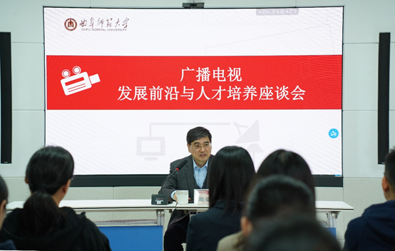 曲阜师大传媒学院讯 4月18日,传媒学院召开“广播电视发展前沿与人才培养座谈会”。山东广播电视台党委副书记、总编辑周盛阔,日照市委宣传部副部长、市文明办公主任王军卫,山东广播电视台体育节目中心主任、山东体育频道发展有限公司董事长吴文峰,山东体育频道发展有限公司总经理赵伟,山东广播电视台体育节目中心办公室主任刘畅,山东广播电视台日照记者站站长王芳,传媒学院党委书记王宏杰、院长王焕景出席会议,传媒学院相关专业师生代表参加座谈。会议由院长王焕景主持。