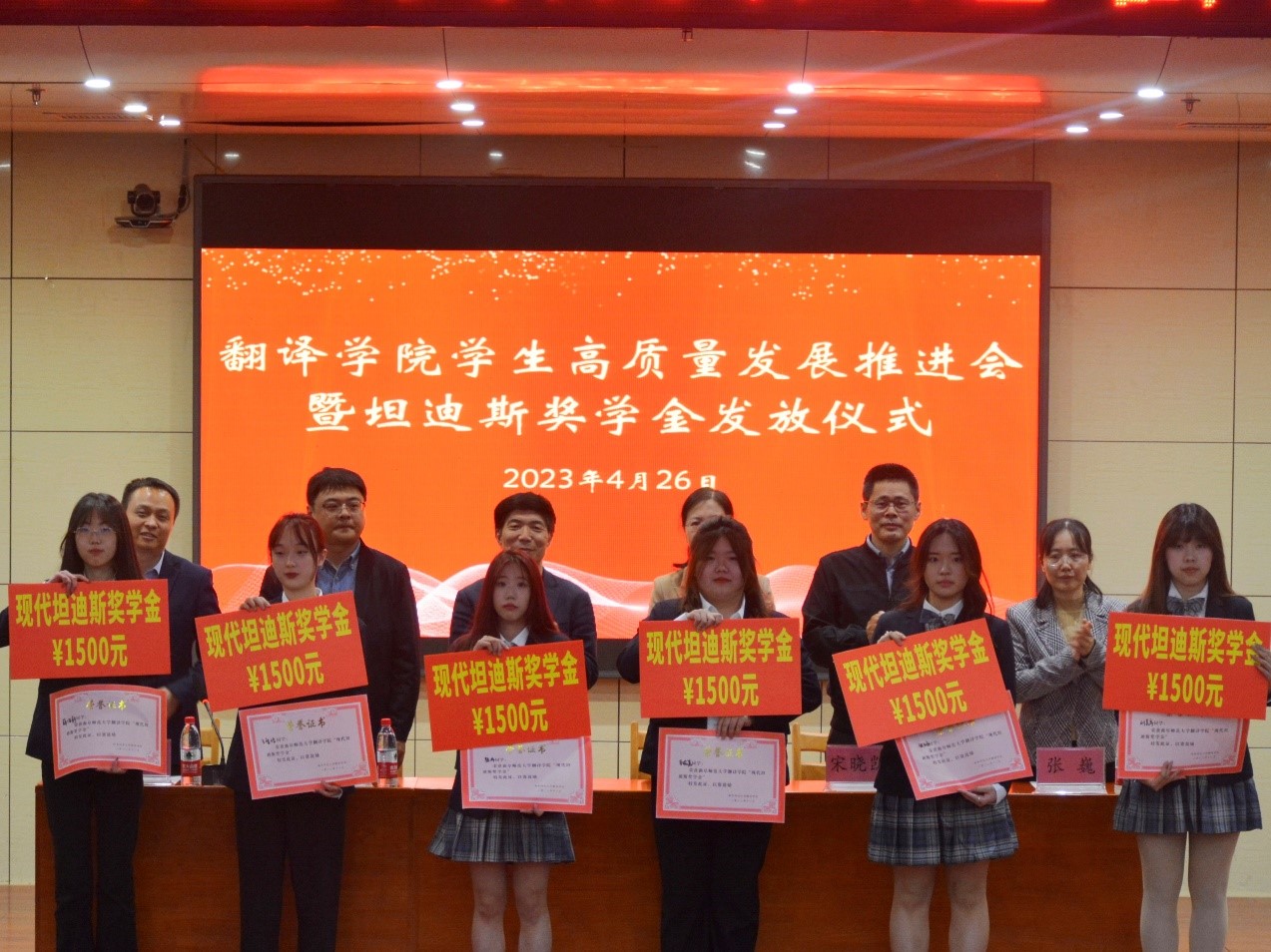 曲阜师大翻译学院讯 4月26日下午,翻译学院2023年学生高质量发展推进会暨坦迪斯奖学金发放仪式于图书馆报告厅举行。翻译学院党委书记宋钧文、院长夏云、学生工作处副处长郑勇、副院长宋晓凯、副教授张巍、全体辅导员出席仪式。学院党委副书记岳峰主持活动。