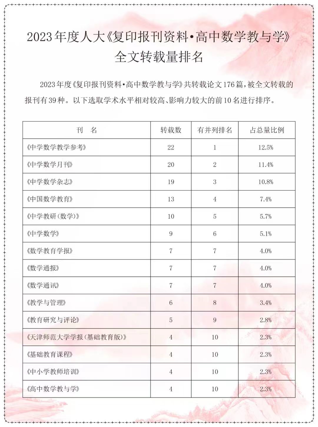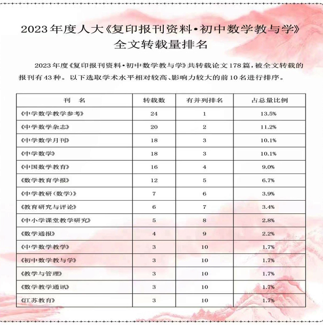 曲阜师大《中学数学杂志》讯 近日,根据中国人民大学书报资料中心全文数据库检索情况,米兰官方网站《中学数学杂志》被《复印报刊资料》系列刊(2023年度)全文转载的文章39篇。《复印报刊资料·初中数学教与学》共转载论文178篇,被全文转载的报刊有43种,《中学数学杂志》(初中版)被转载20篇,占总量的11.2%,第2名;《复印报刊资料·高中数学教与学》共转载论文176篇,被全文转载的报刊有39种,《中学数学杂志》(高中版)被转载19篇,占总量的10.8%,排名第3;全年总转载数39篇,第2名;杂志全年总发文数184篇,被转载比全国同类期刊第1。