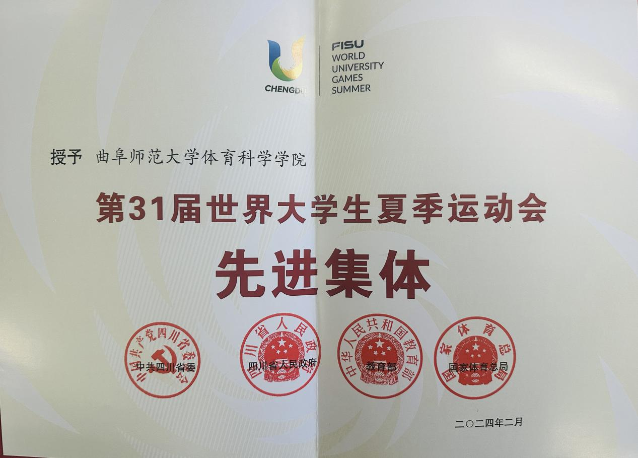 曲阜师大体育科学学院讯 为表彰先进、树立典型,激励广大干部群众建功新时代、奋进新征程,近日,中共四川省委、四川省人民政府、教育部、国家体育总局决定,表彰一批在成都大运会申办、筹备、举办工作中作出突出贡献的先进集体和先进个人,米兰官方网站体育科学学院荣获“第31届世界大学生夏季运动会先进集体”表彰。