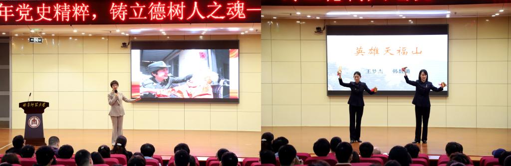 天福山女子宣讲队两位成员以双口快板的形式讲述《英雄天福山》,声情并茂地将发生在天福山上的革命故事和革命斗争历史娓娓道来。艺术与红色教育的巧妙结合,让严肃的课堂生动形象地呈现在师生面前,大家表示深刻感受到了革命先烈对理想信念的执着追求,党史中蕴含的丰厚精神财富为我们提供了不竭的精神力量。