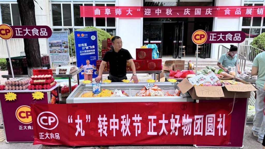 本次展销会邀请了山东优品鲜到食品供应链有限公司、曲阜市鑫海商贸有限公司、望家欢农产品集团有限公司等学校食堂大宗物资供应商以及孔府香油、孔府月饼等26家地方特色品牌单位参展,集中展销了蔬菜、水果、杂粮、肉类、油类、冷冻产品、饮品、中秋月饼以及调料等几十种产品。
