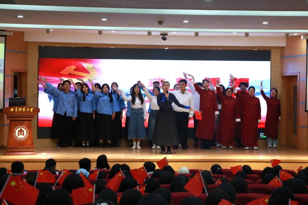 最后,全体师生合唱歌曲《有我》。舞台上,领唱的同学挥舞五星红旗,舞台下,全体师生起立合唱,共同唱出心中的梦想。歌声充满力量与希望,表达了新时代青年勇担时代重任的决心与信心。现场气氛热烈,掌声不断,为新生思政课画上了圆满的句号。