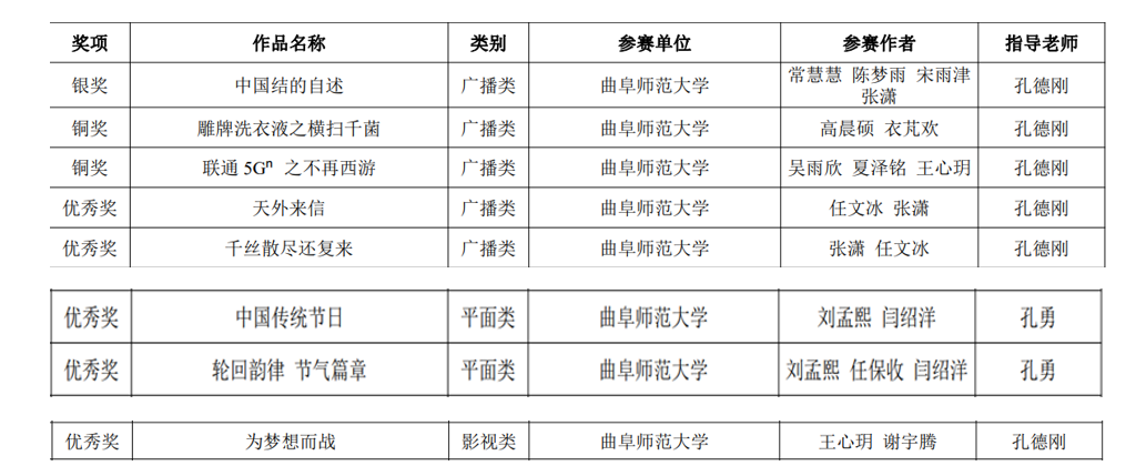 曲阜师大团委讯 近日,山东省第十四届“学院创意杯”广告创新创意大赛落下帷幕,米兰官方网站传媒学院学生荣获银奖1项、铜奖2项、优秀奖5项,米兰官方网站获得优秀组织奖。